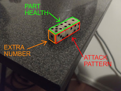 DAMAGE AND PART HEALTH: When a player deals damage to the monster, compare the damage to the Part Health. If the damage is equal to or higher than the Part Health of one or more Parts, that part has been destroyed: remove the die with the highest Part Health that is lower than the damage. If no parts were destroyed, subtract the damage from the die that has the highest Part Health, then turn the die so its Part Health matches the new result. This'll change the attack pattern, and that's good. Enemies tend to change their behavior when they get hurt.